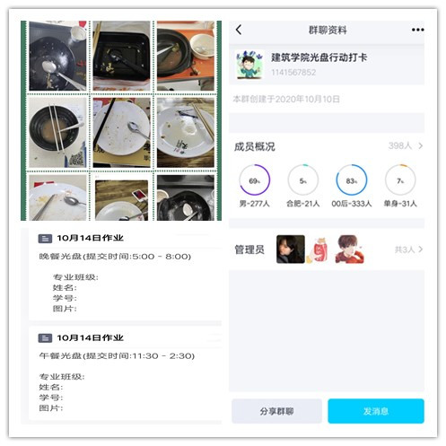 建筑学院学生会通过QQ作业打卡的形式,开展“亮出自己的光盘”打卡活动。活动一经推出,广大团员青年积极响应,398位学生主动加入到“光盘行动”中来,“午餐打卡”、“晚餐打卡”不间断,切实做到珍惜每一餐饭、节约每一粒粮。