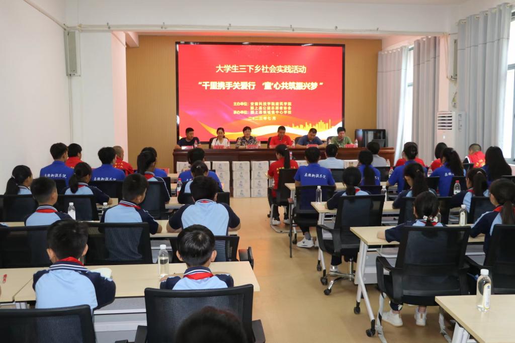 为深入学习贯彻习近平新时代中国特色社会主义思想,强化在实践中受教育、长才干、做贡献,7月15日上午,由必一体育平台_必一体育平台(中国)股份有限公司建筑学院和颍上县公益志愿者协会主办,颍上县慎城镇中心学校承办的“千里携手关爱行,‘童’心共筑振兴梦”暑期社会实践启动仪式如期举行。建筑学院党委副书记谢宜勤、团委书记沈德艳、团委副书记武辉一行三人前往参加。启动仪式由颍上县公益志愿者协会会长、“中国好人”获得者汤锋主持。
