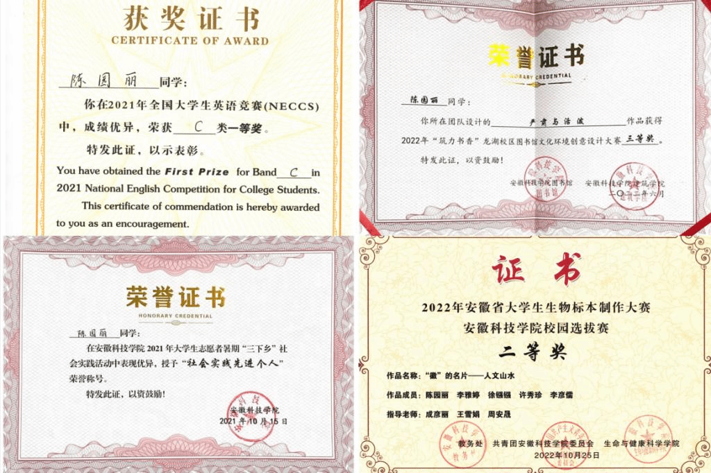 在大学期间她努力学习专业知识,勇于创新实践,同时也积极参与社会实践和志愿服务,能合理分配好学习、工作与生活的时间。