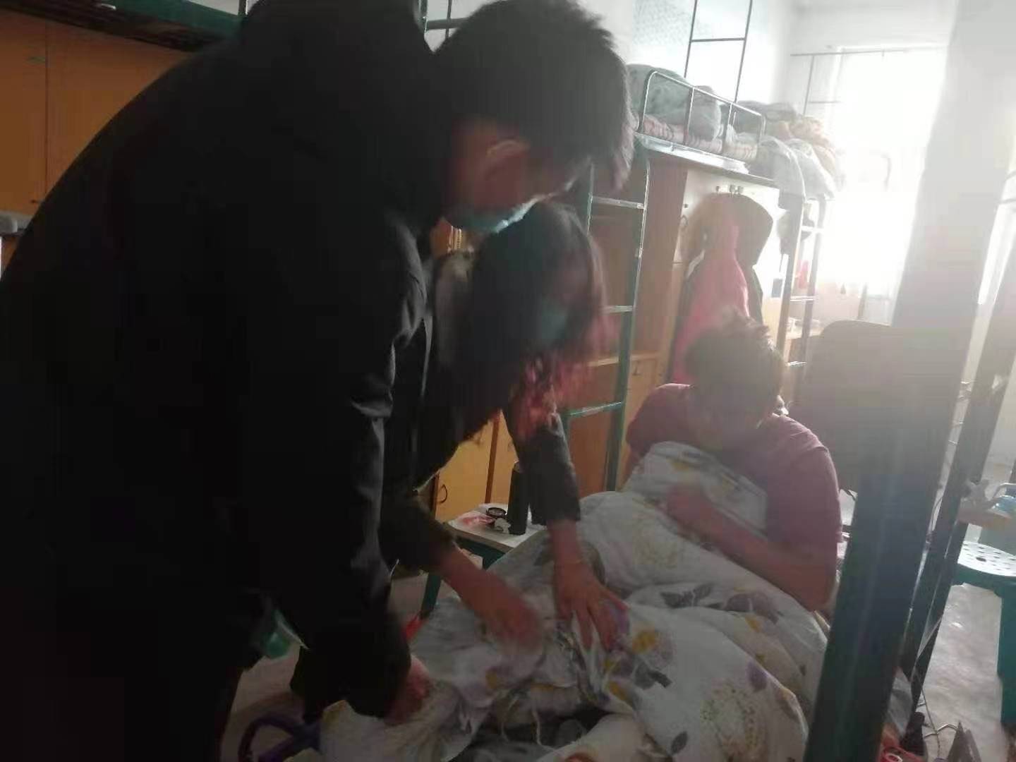 西园1号楼一位男生因打球脚受伤,宿管到宿舍看望,并给他带去了骨头汤,叮嘱他好好养伤,有困难随时打宿管电话。