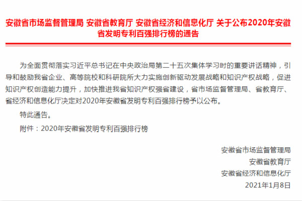 1月8日,安徽省市场监督管理局、省教育厅、省经济和信息化厅联合发文公布了2020年安徽省发明专利百强排行榜,我校综合排名全省第45位,较上年上升3个位次,位列全省高校第9位,省内同类高校排名第1位。这是自2015年安徽省首次发布发明专利百强榜以来,我校第五次上榜。