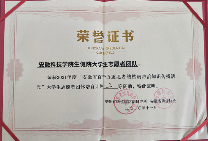 生命与健康科学学院青年志愿者团体组建于2019年,是滁州市第二个大学生志愿团体。该团体自成立以来,结合疫情防控,组织开展了形式多样、内容丰富的结核病防治宣传活动,提高了学校师生和凤阳县及当地市民对结核病防治工作的认识,营造了全社会共同关注结核病防治的良好氛围,2020年,该团体荣获2020年度省“百千万志愿者结核病防治知识传播活动”大学生志愿者团体培育计划三等资助,这是该团体第二次获此立项资助。