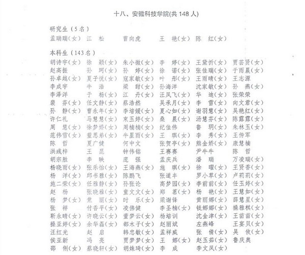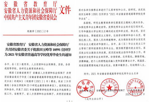 日前,安徽省教育厅、安徽省人力资源和社会保障厅、中国共产主义青年团安徽省委员会下发了《关于批准田玉峰等10591位同学为2021年安徽省普通高等学校优秀毕业生的通知》,我校孟瑞瑞等148名同学被授予“2021年安徽省普通高等学校优秀毕业生”荣誉称号。