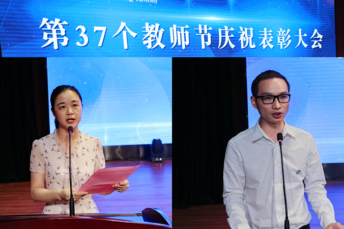 老教师代表、化学与材料工程学院唐婧博士,新进教师代表、资源与环境学院田文博士先后发言,人文学院汤佳慧同学代表全校学生作教师节献词。