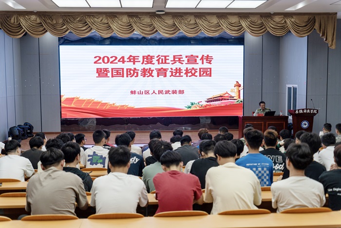6月5日下午,应学校征兵工作办公室邀请,蚌埠市蚌埠山区人民武装部部长曾鸣一行在龙湖校区敏行楼A座报告厅开展应征入伍政策及国防教育专题报告会。校党委学工部副部长、学生处副处长陆双双,各学院征兵工作联系人、两校区志愿应征入伍的学生代表近200人参加了报告会。