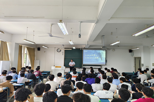 6月7日,李升和在凤阳校区新知楼A210教室为机械工程学院2023级机械设计制造及其自动化专业本科生讲授“当前就业形势与实施就业优先战略”专题“形势与政策”课。