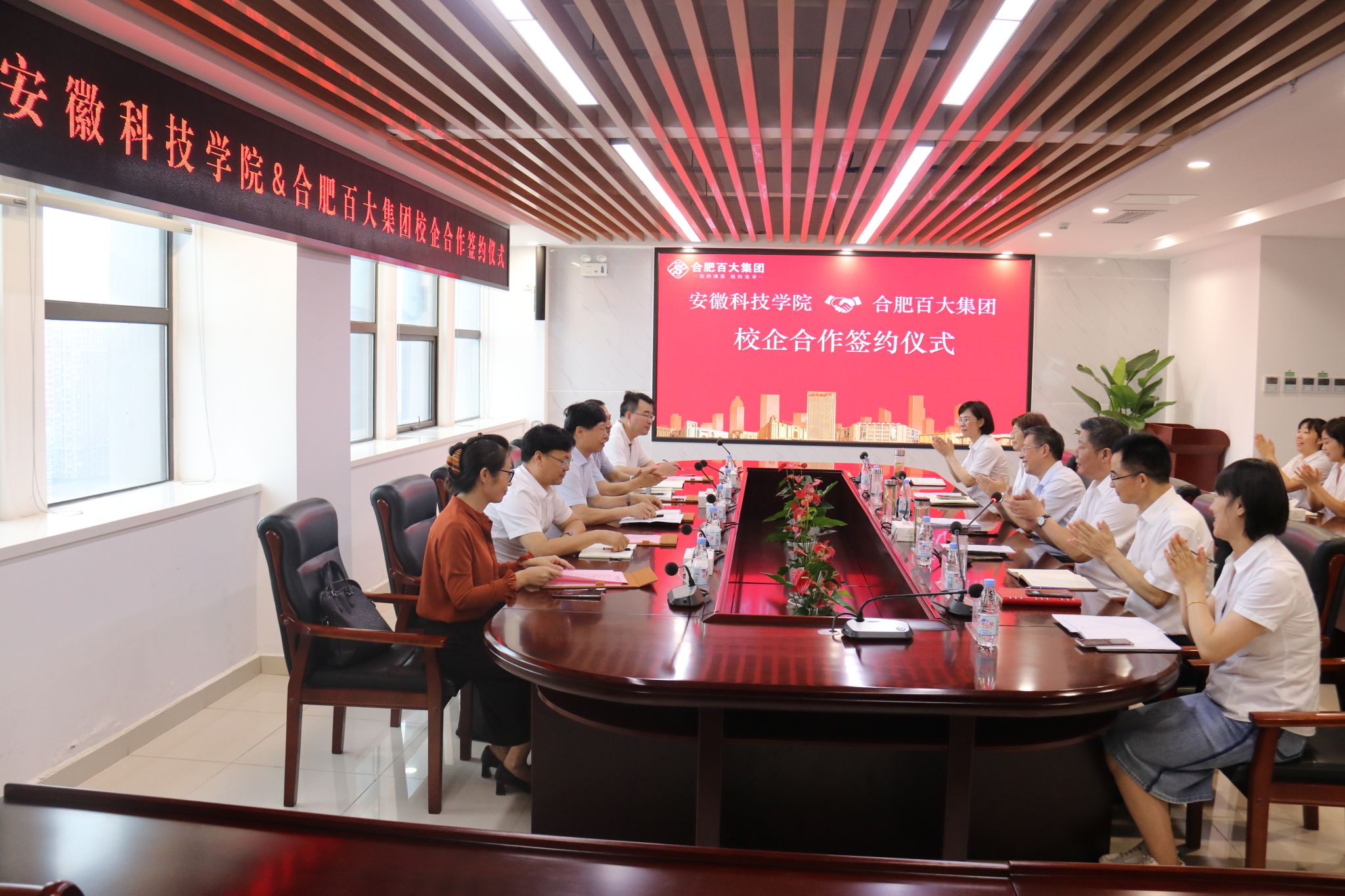 财经学院院长郝世绵和百大集团党委委员、工会主席裴文娟代表双方签署了《合肥百大集团 必一体育平台_必一体育平台(中国)股份有限公司战略合作协议》;双方观看了合肥百大集团宣传片,并围绕智力共用、人才共育、项目共研、平台共享等进行深入交流。