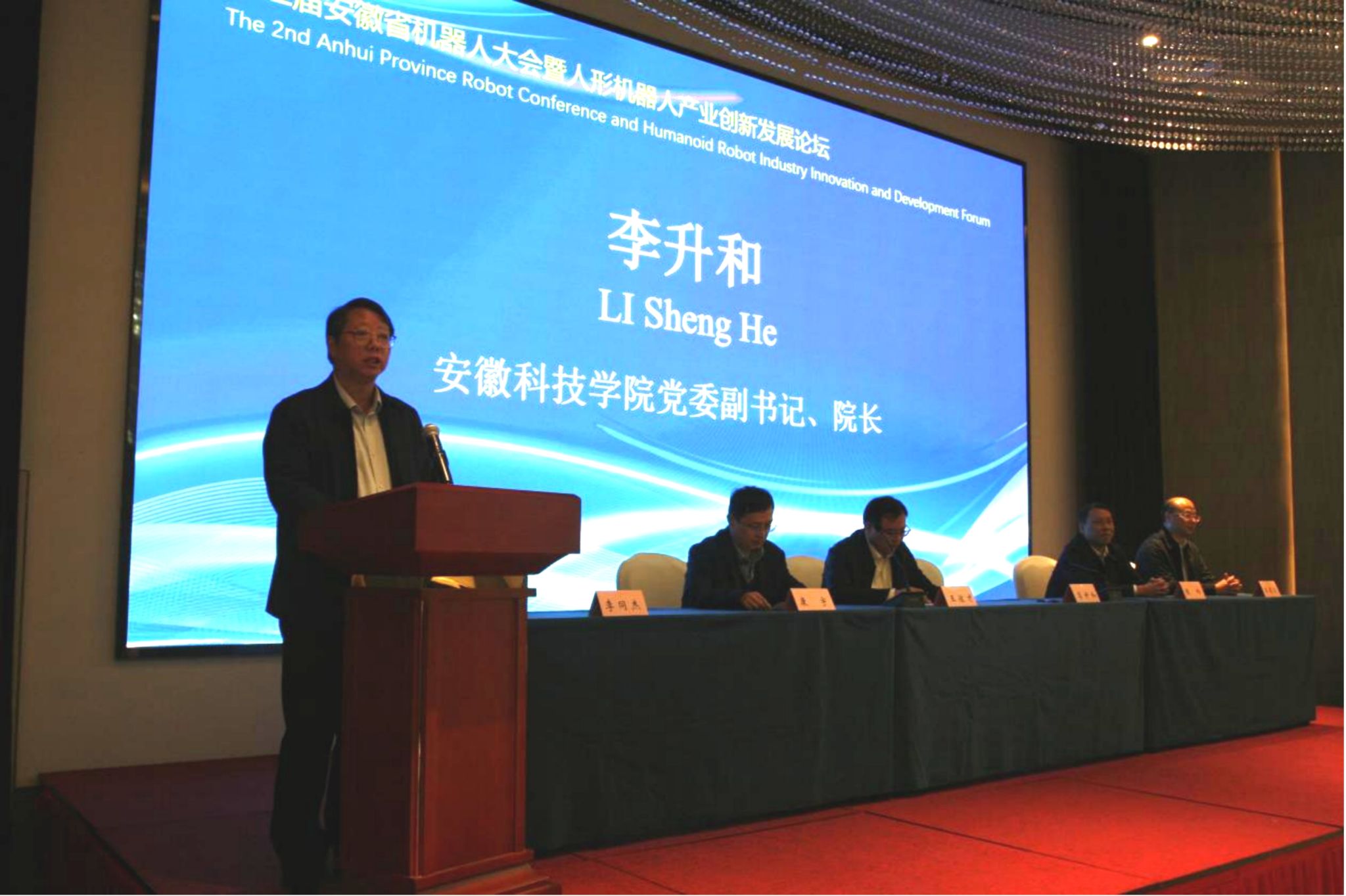 10月26日,第二届安徽省机器人大会暨人形机器人产业创新发展论坛在凤阳举办。安徽省科协党组成员、副主席王佐才教授,安徽省机器人学会副理事长康宇教授,滁州市科协党组书记、主席陈岭以及我校党委副书记、院长李升和教授,党委委员、副院长王孝义教授等出席开幕式并在主席台就坐。来自省内外30余所高校、科研单位和企业共120余名专家学者参加会议。大会开幕式由机械工程学院副院长(主持工作)李同杰教授主持。