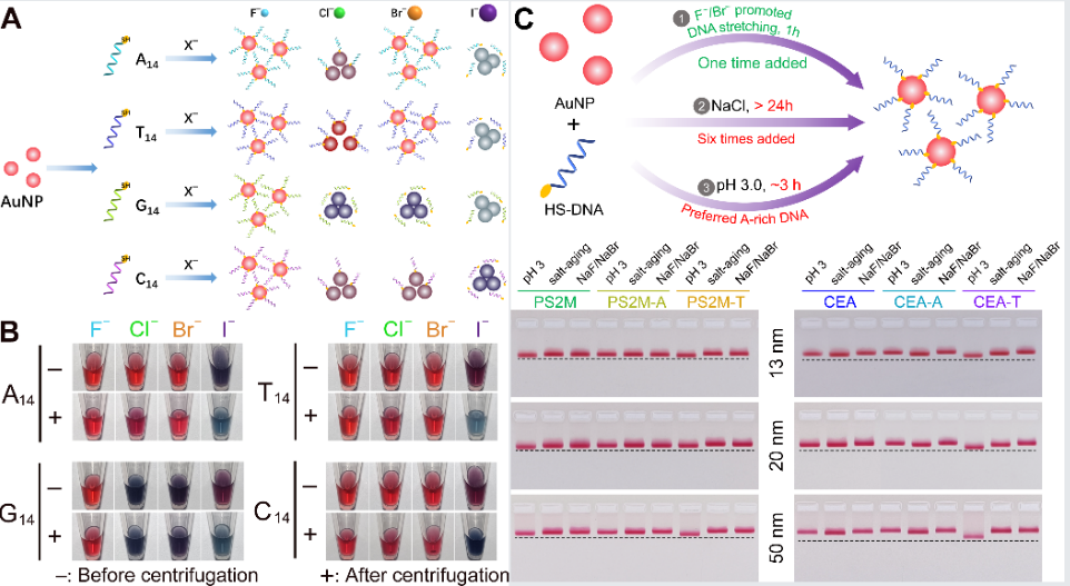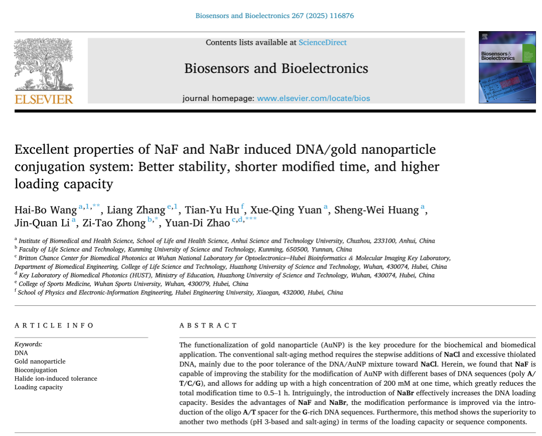 近日,我校生命与健康科学学院王海波博士(第一/通讯作者)在生物传感领域国际顶级期刊《Biosensors & Bioelectronics》(中国科学院一区Top期刊,影响因子:10.7,CiteScore:20.80)在线发表了题为“Excellent properties of NaF and NaBr induced DNA/gold nanoparticle conjugation system: Better stability, shorter modified time, and higher loading capacity”的研究成果,DOI: 10.1016/j.bios.2024.116876。该论文第一单位为必一体育平台_必一体育平台(中国)股份有限公司,昆明理工大学钟子涛博士和华中科技大学赵元弟教授为共同通讯作者。本研究在安徽省教育厅重点项目(2023AH051869)、必一体育平台_必一体育平台(中国)股份有限公司引进人才项目(200181)以及安徽雪郎生物科技股份有限公司的经费资助下完成。