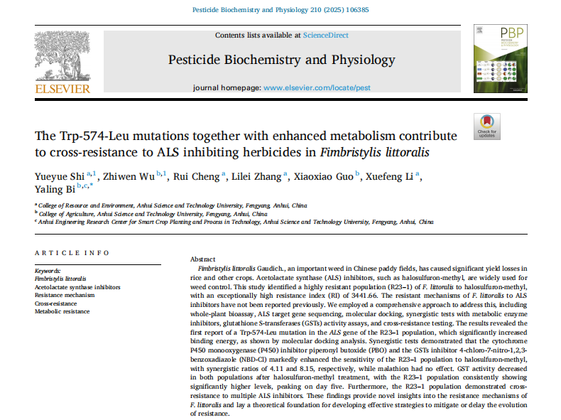 近日,我校农学院毕亚玲教授团队在国际知名期刊《Pesticide Biochemistry and Physiology》(中国科学院一区Top期刊,IF=4.2)发表了题为“The Trp-574-Leu mutations together with enhanced metabolism contribute to cross-resistance to ALS inhibiting herbicides inFimbristylis littoralis”的研究论文。