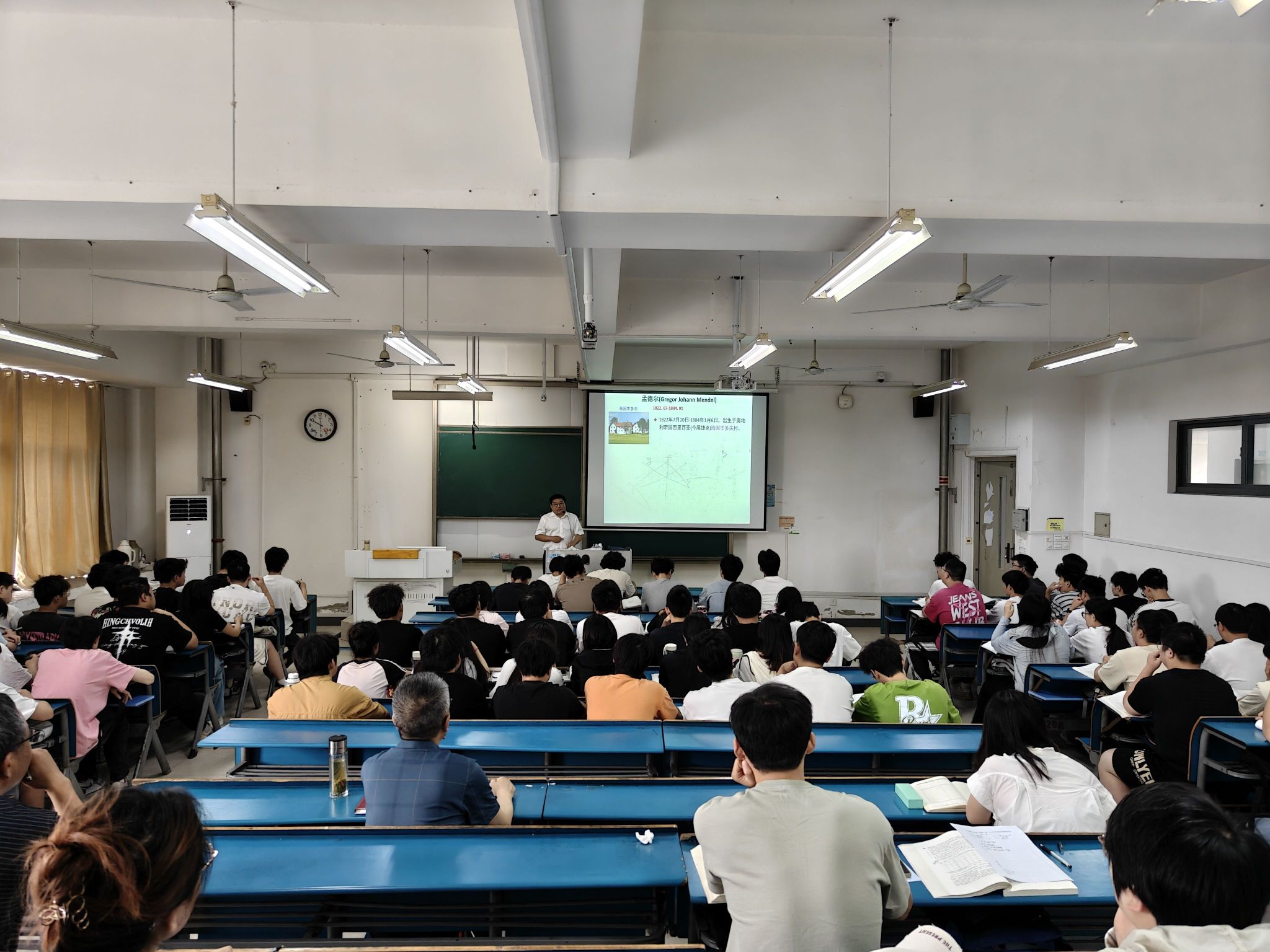 黄先忠以生动的个人经历导入课程,从在欧洲求学期间与孟德尔研究所的渊源讲起,引出孟德尔遗传学的历史背景与科学价值。随后,他结合课本内容,向学生展示了孟德尔实验中所用的豌豆实物,直观阐释了豌豆性状的遗传特点,帮助学生深化对分离定律和自由组合定律的理解。授课过程中,他将经典理论与现代遗传学进展相结合,通过案例分析启发学生思考,课堂氛围活跃,师生互动热烈。