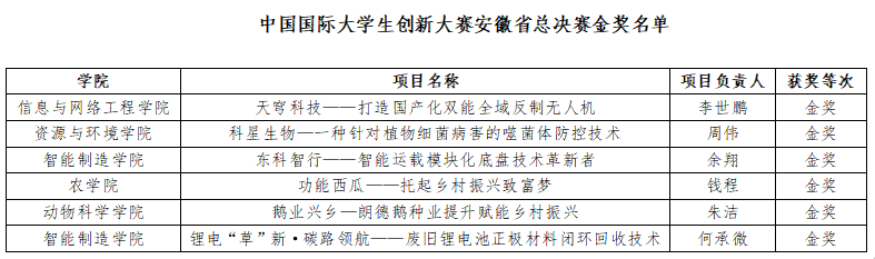 近日,安徽省大学生创新大赛(2025)获奖名单公布,我校共获奖48项,其中“天穹科技——打造国产化双能全域反制无人机”等6个项目获省赛金奖,“神机妙彘——生猪智慧养殖装备行业领跑者”等14个项目获省赛银奖,“智联碳控——智控节能搭快车,助力全球双碳目标”等28个项目获省赛铜奖。省赛金奖数量及获奖总数在省内地方应用型高校中排在前列,陈建国、李同杰、朱琳、吴燕、叶鹏飞、查文珂六位教师获优秀创新创业导师奖。
