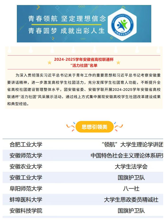 11月9日,安徽学联发布2024-2025学年安徽省高校联通杯“活力社团”名单,我校国旗护卫队经过线上答辩脱颖而出,荣获思想引领类省级“活力社团”,安徽省高校联通杯“活力社团”风采展示活动由团安徽省委、安徽学联举办,通过线上方式集中展现安徽高校学生社团改革建设成果和典型经验。