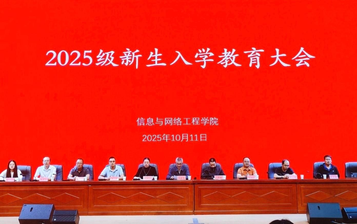 10月11日中午,信息与网络工程学院在信息中心东辅楼二楼报告厅召开2025级新生入学教育大会。学院党政领导、各系室主任、教师代表、全体辅导员及2025级全体新生参加会议。会议由学院党委副书记韦乃学主持。