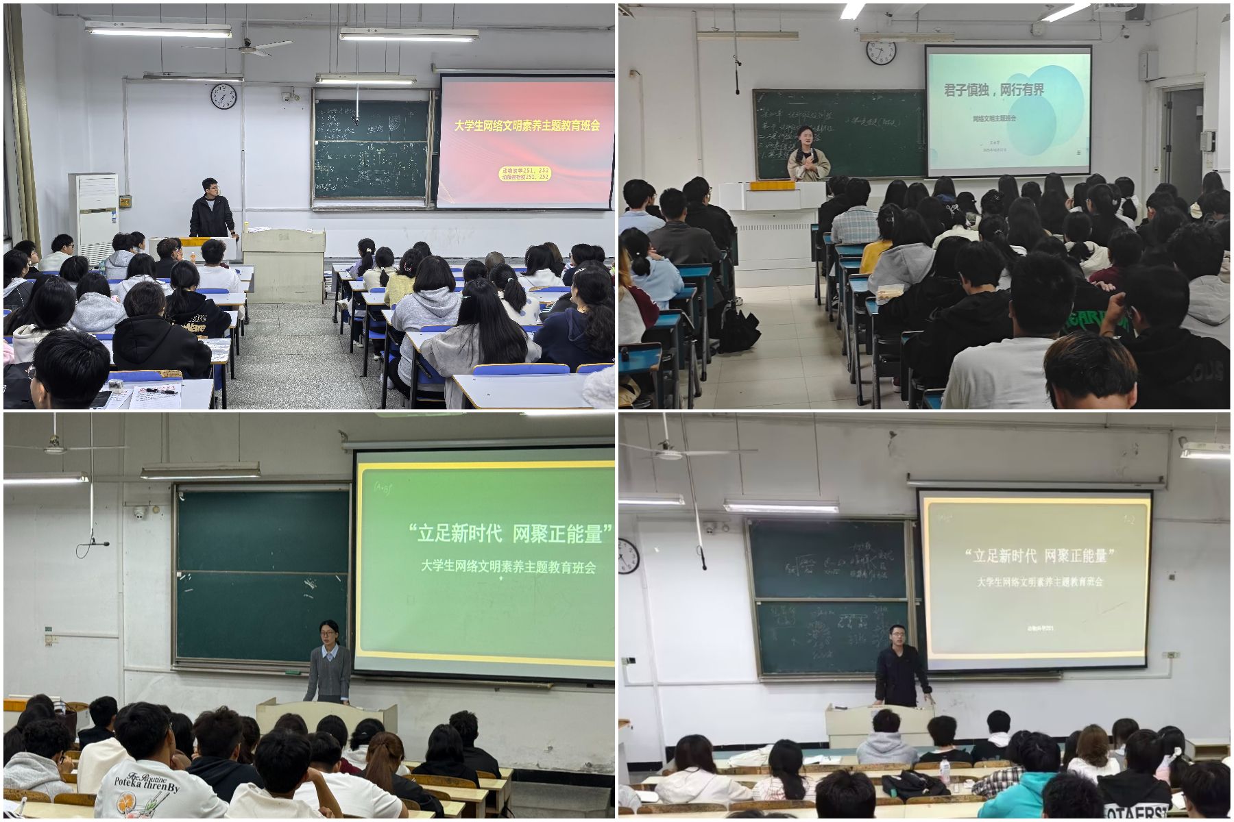 10月12日至19日,动物科学学院组织开展“立足新时代·网聚正能量”大学生网络文明素养主题教育,各班级辅导员通过主题班会的方式,围绕文明上网、安全防护、道德自律召开主题班会,全院48个班级,1000余名学生参与。