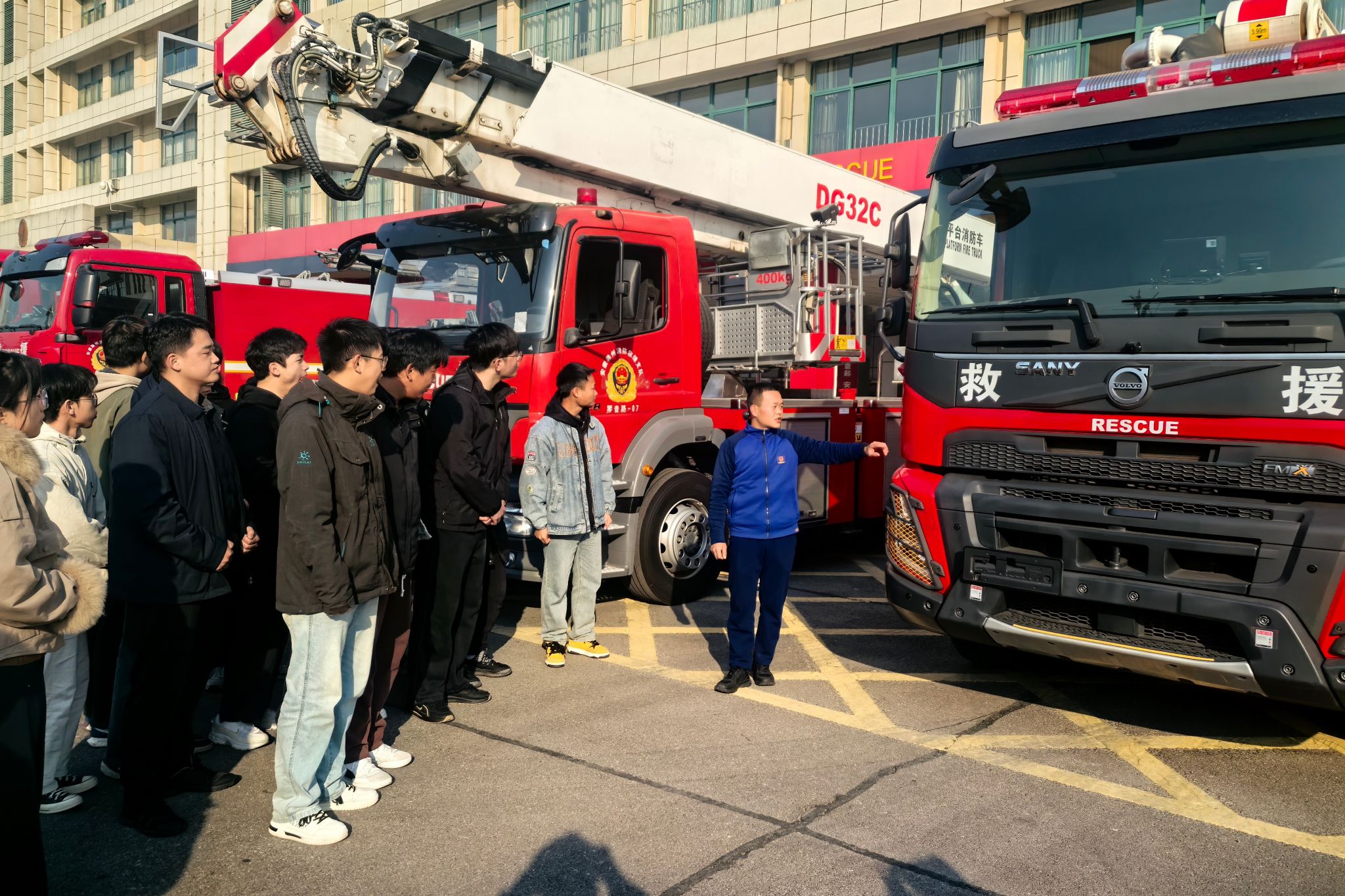 本次活动以沉浸式体验为主线,内容充实,环节紧凑。在消防官兵的引导下,同学们系统参观了各类先进的消防装备,认真聆听消防员对不同装备的功能特性、操作规范及实战应用的专业细致讲解。在随后进行的互动环节中,同学们在消防员专业指导下亲身体验了消防救援服的穿戴,并深入了解了各类消防车辆及灭火机器人的差异化功能与作战场景。活动尾声,同学们观看了40米高喷消防车的高空灭火操作演示,观摩了部分日常训练项目,见证了消防员们一分钟内出警的全过程。