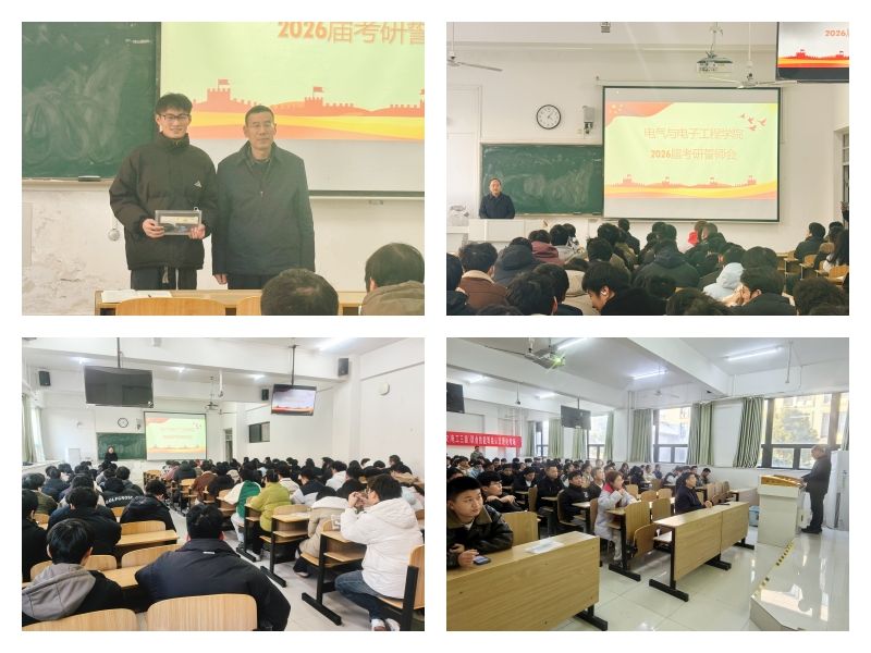 为发挥学院全过程育人实效,12月3日下午,电气与电子工程学院在致知楼A108教室举行了2026届毕业生考研誓师会。学院党委书记骆海邦,党委副书记尚磊,各毕业班辅导员,近200名考研学子参加会议。