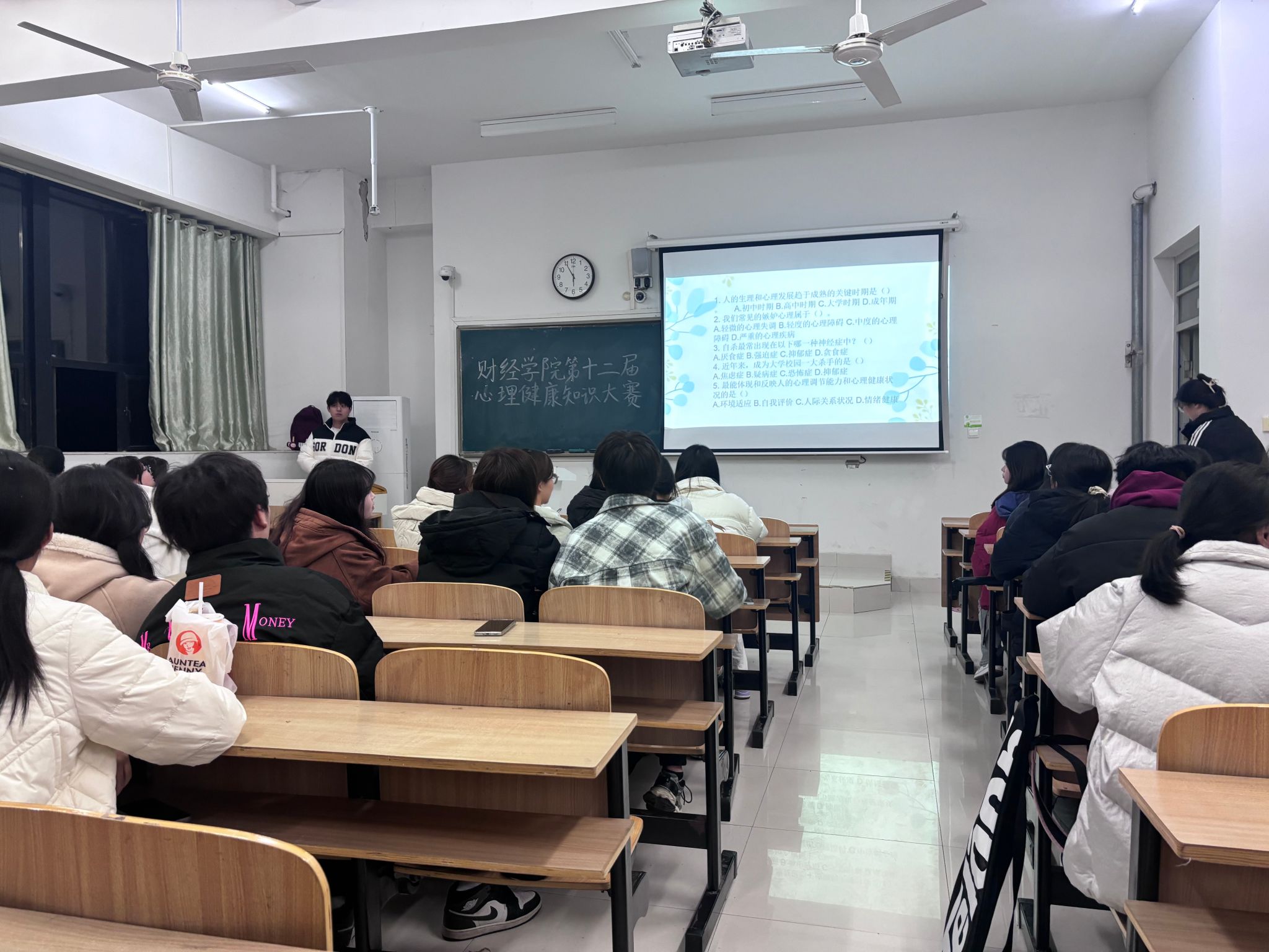 为进一步普及心理健康知识,提升学生心理健康素养,营造积极健康的校园心理氛围,12月7日晚,财经学院在致知楼C109教室举办了第十届心理健康知识竞赛。学院心理辅导老师薛枫全程指导。来自2025级各专业班级的40余名同学参加竞赛。