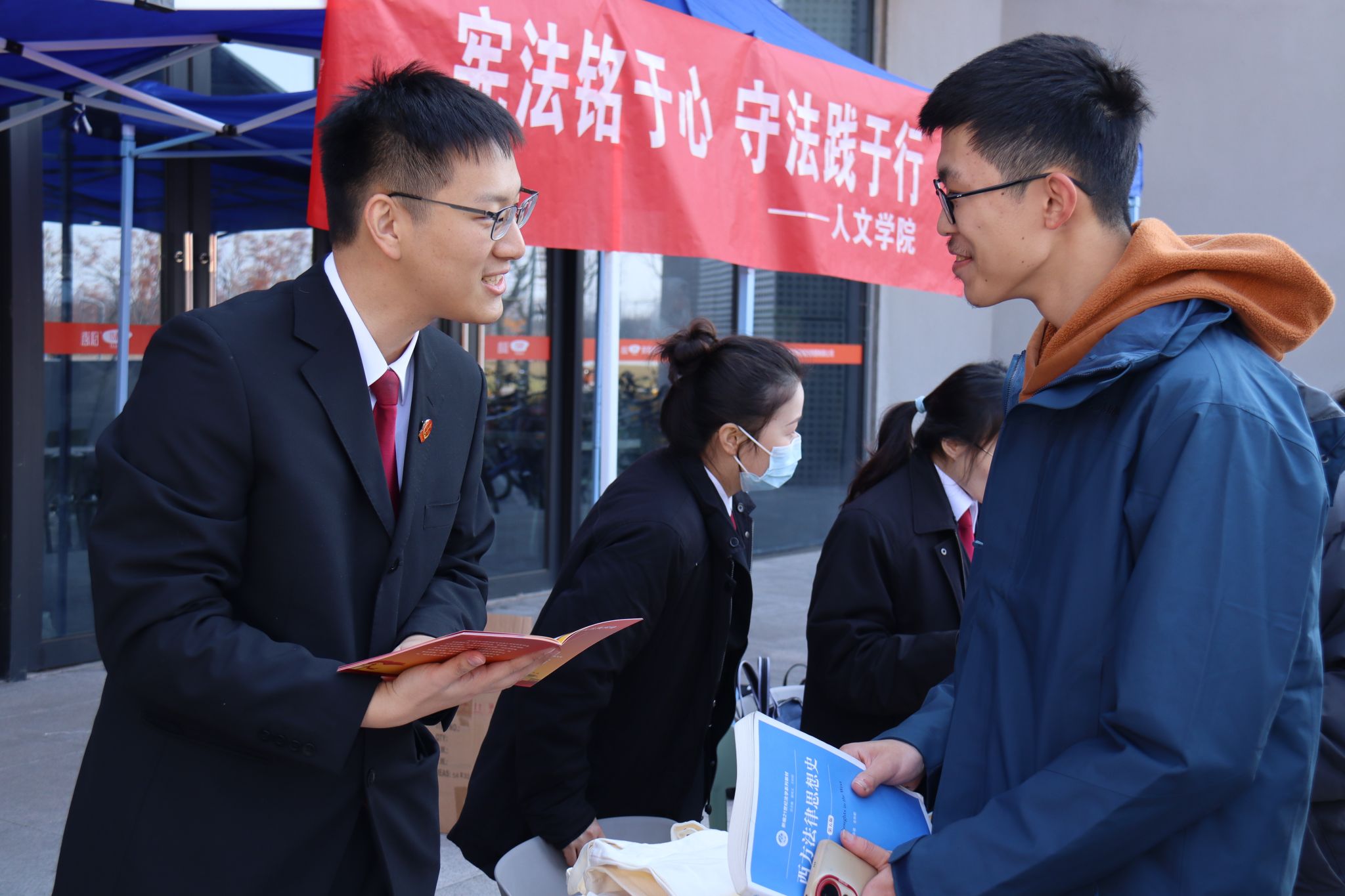 12月5日中午,人文学院在丰味园广场举办宪法宣传活动,特邀滁州市中级人民法院法官及干警走进校园,搭建“零距离”学法平台。活动现场氛围庄重而热烈,法院干警秉持“贴近校园、贴近师生、贴近生活”的原则,精心设计宪法知识问答、法律案例解析等互动环节。师生们踊跃参与答题,在轻松愉快的互动中深化了对法治知识的认知;针对同学们普遍关心的就业维权、校园纠纷、网络安全等法律问题,法官们逐一耐心解读、细致剖析。宪法宣誓签名墙前,师生们纷纷驻足,郑重签下自己的名字,以实际行动表达对宪法的尊崇与敬畏,以及践行法治精神的坚定决心。