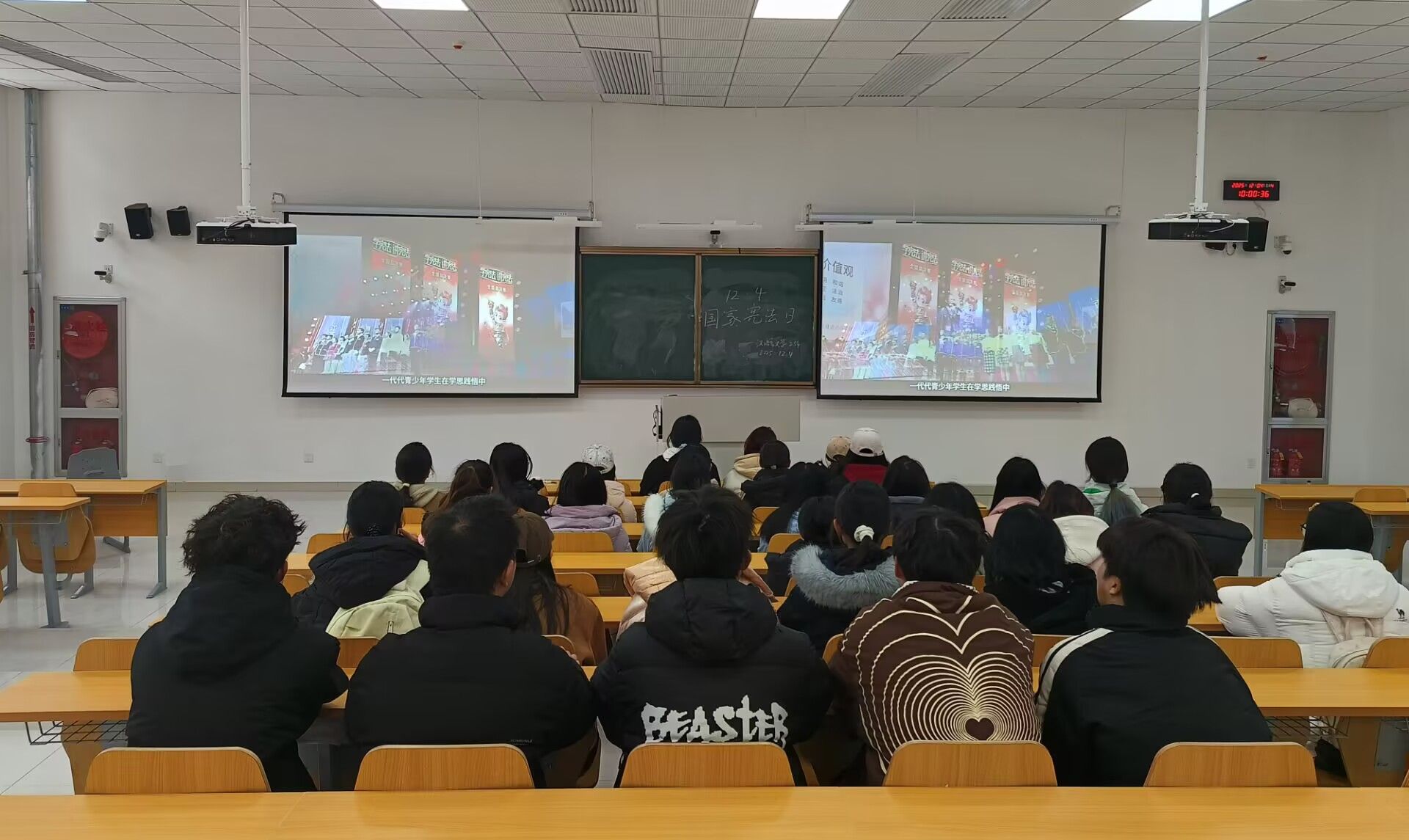 12月4日上午,人文学院组织各班级集中开展宪法晨读活动,并通过普法网进行同步直播,让青春之声传递宪法力量。教室内,同学们神情庄重肃穆,齐声诵读宪法核心条款。铿锵有力的书声回荡在校园的每个角落。集体诵读的过程,不仅是对宪法文本的学习,更是对宪法权威的崇高致敬。此次直播活动吸引了众多师生及社会各界人士在线观看,充分展现了人文学子“以青春之我、筑法治中国”的坚定信念与责任担当。