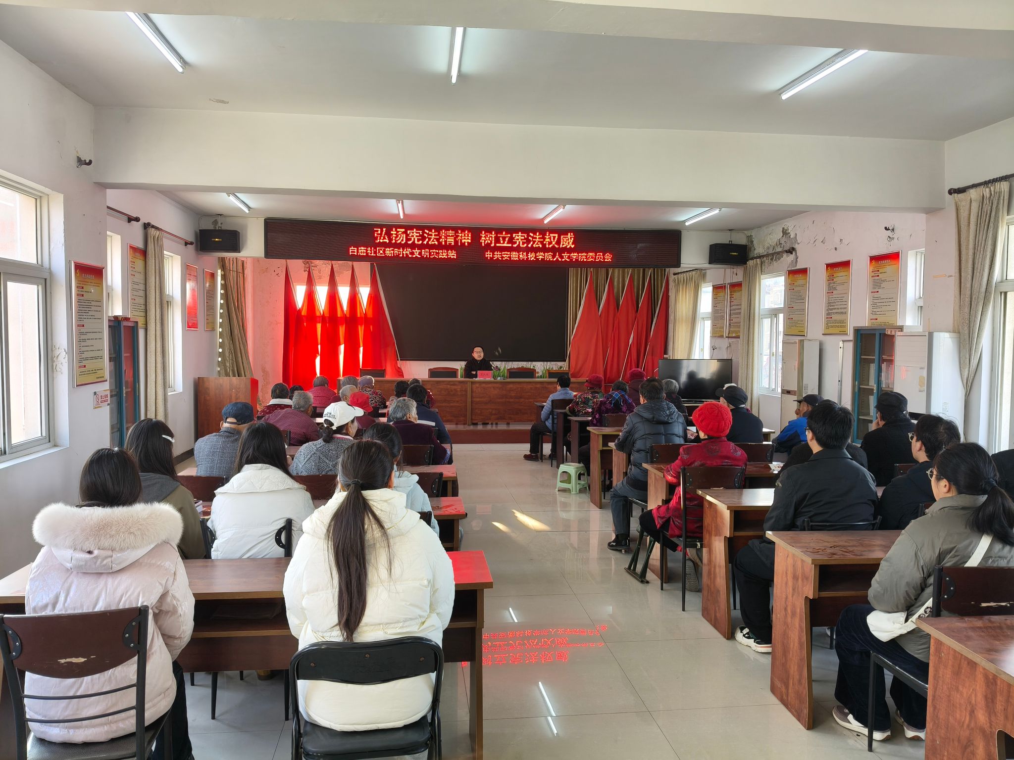 12月3日下午,人文学院宪法宣传队伍走进白庙社区,开展“送法上门”志愿服务活动。活动现场,志愿者们向社区居民发放宪法宣传手册、法律知识读本等资料,普及与日常生活紧密相关的宪法知识。王洪雨老师受邀开展专题宣讲,他巧妙将抽象的宪法条文与鲜活的百姓生活实例相结合,用通俗易懂的语言生动阐释宪法对公民基本权利的保障作用,让居民们真切体会到“宪法不仅是国家根本大法,更是守护日常生活的坚实基石”的深刻内涵,有效提升了社区居民的宪法意识和法治素养。
