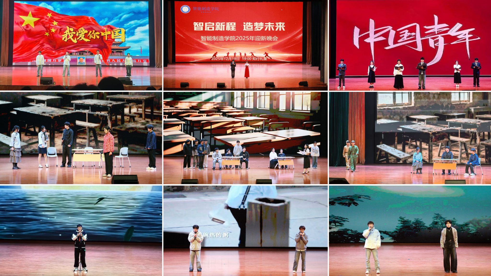 本次迎新晚会节目形式多样、内容丰富,涵盖歌曲、小品、乐器演奏、朗诵、情景剧、合唱等,充分彰显了大学生的青春风采。开场歌曲《NOT GOOD》用动感的旋律瞬间点燃现场氛围,歌曲《年少有为》深情表达了青春理想与奋斗初心,朗诵《闪耀吧青春的火光》则以铿锵的语调抒发青年学子的壮志豪情,话剧《“守”邦“兴”国》再现了抗战时期爱国青年为了保家卫国与日本侵略者英勇顽强斗争的情景;大合唱《我爱你中国》将晚会气氛推向高潮,全场师生共同高歌,抒发爱国情怀。
