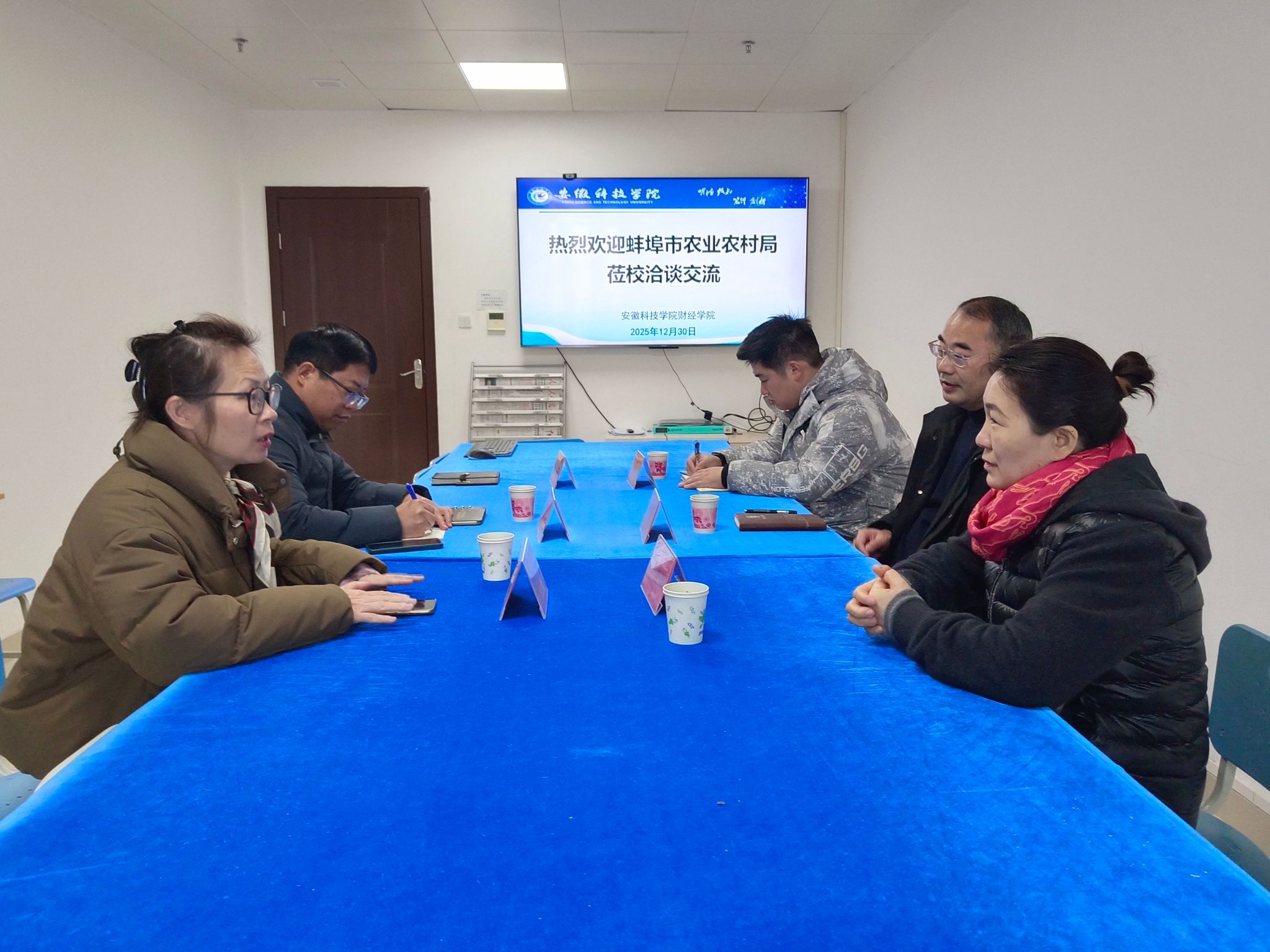 12月30日,蚌埠市农业农村局党组成员、副局长陈运来校交流洽谈电商合作事宜。财经学院党委书记杜小明、院长郝世绵,动物科学学院副院长华金玲教授、徐高青博士参加洽谈会,会议由郝世绵主持。
