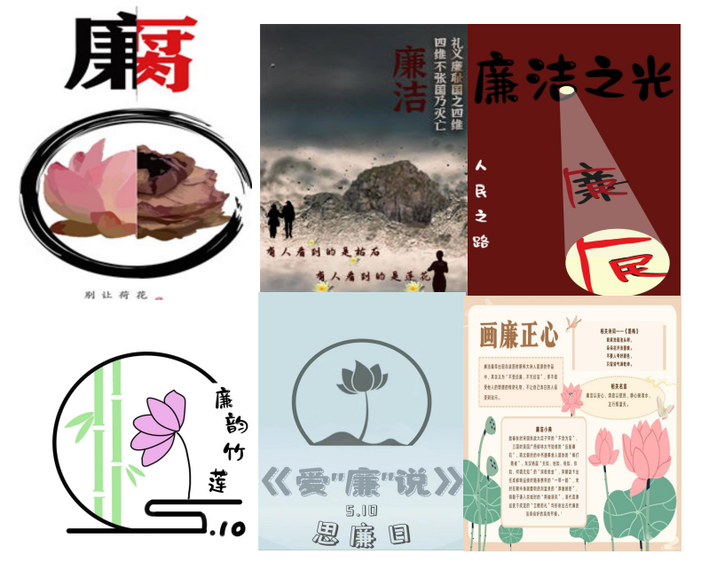 “双手绘廉,画廉正心”。师生们从校园文化、历史古迹、文献资料中寻找灵感,创作主题海报、文创设计,将廉洁文化与绘画创意巧妙融合。或是黑白荷花象征的“青莲”,或是红色底色的廉洁文创;绘画海报设计更是别出心裁、多出新裁,元素发挥尽显灵感,作品紧抓廉洁中心要素,墨竹元素展示清正气节,莲花亭亭表明清白无染,“廉谱”新奇,映衬清廉威严。这些作品浸润廉洁底色,镶嵌廉洁内涵,以清风为“笔”,以正义为“墨”,绘画廉洁之道,用廉洁的海报呼唤人们共同的正义追求。人文学子寓廉于乐、融廉于趣、化廉于心。