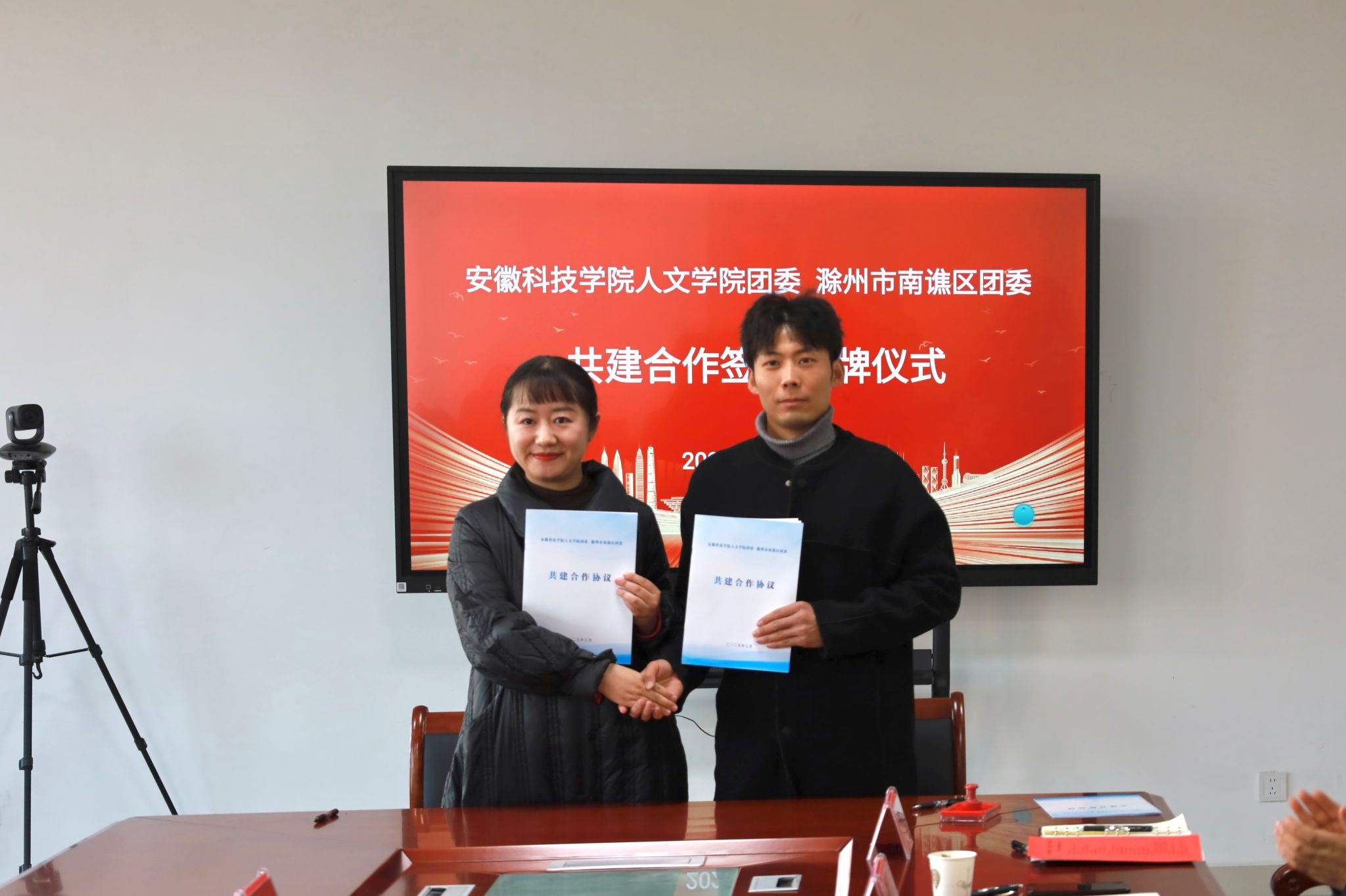 为不断创新共青团工作机制,推进校地团学资源融合,实现优势互补、合作共赢,更好服务广大青年的成长成才,3月19日下午,人文学院团委与滁州市南谯区团委举行共建合作签约授牌仪式。共青团滁州市委书记李国金、副书记戴莺,南谯区委常委、组织部部长程娟,共青团南谯区委书记徐迟,学院党委副书记、院长李晓东,正处级组织员张严政,副院长牛永辉,党委副书记李沙娜,党政办副主任方明旺,团委副书记焦雪松等出席,仪式由张严政主持。