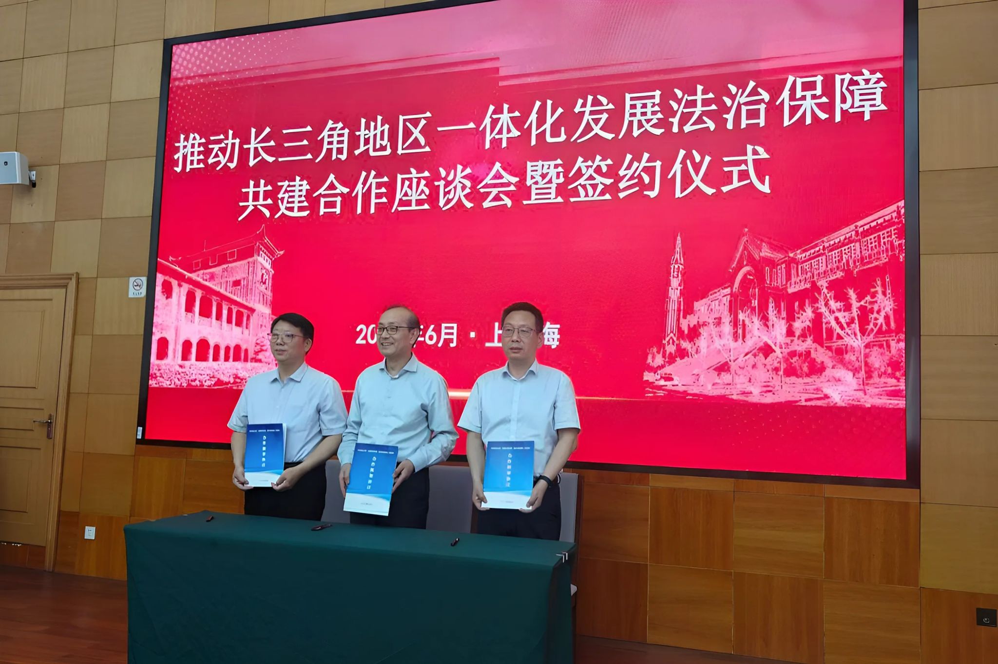 会上,李升和、叶青、吴磊代表三方签署《长三角地区一体化发展法治保障共建合作框架协议》,标志着三方正式建立全方位、多层次的法治保障合作机制。随后,李升和、王玉和与叶青、吴磊共同为“低空经济法律保障基地”“半导体和信息产业法律保障联合实验室”揭牌。李升和为特聘教授、兼职教授颁发聘书。(特约通讯员:高晓宁 摄影:徐靖宇 审核:牛永辉 李晓东)