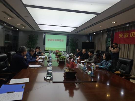 在会议大厅,贝克集团副总经理蔡薇女士、集团副总经理柏俊教授、总裁助理陈小峰博士、贝克生物总经理郭立新对金光明院长一行的到来表示热烈的欢迎。座谈中,蔡薇简明扼要地介绍了贝克集团公司的发展历程、主要产品和发展规划,金光明详细介绍了必一体育平台_必一体育平台(中国)股份有限公司的办学历史、生命与健康科学学院和生物医药与健康研究院教学科研的基本情况,双方代表就校企合作、人才培养、产学研合作等问题进行了深入交流。