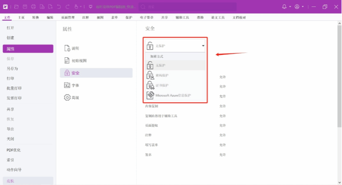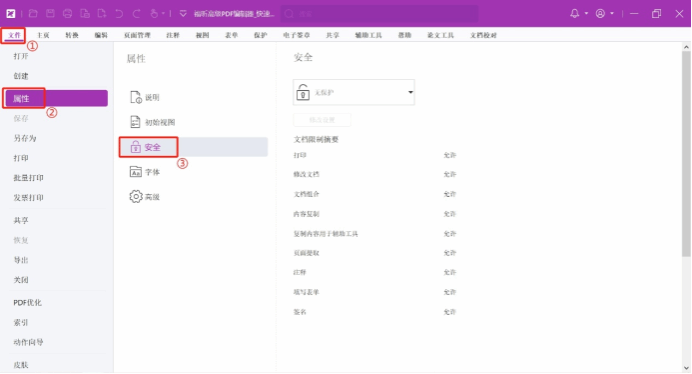 我们利用福昕高级PDF编辑器打开一份文档,点击左上角【文件】>【属性】>【安全】,这时就可以在右侧看到权限情况。如下图,该文档是无密码保护的。