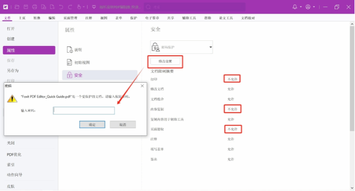如以下文档有【密码保护】,显示不允许打印、内容复制等;此时如果我们需要对其进行打印,则需要输入正确的密码,并将权限修改成允许打印才可以进行打印。