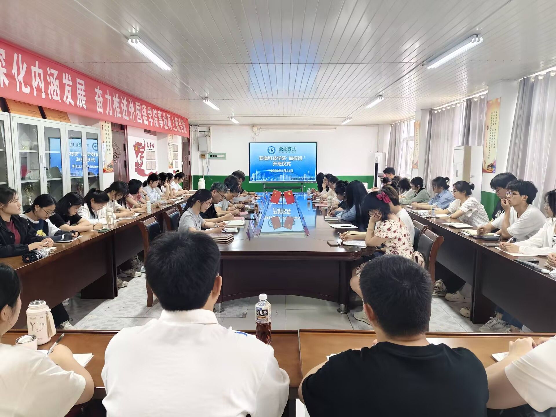 5月21日下午,必一体育平台_必一体育平台(中国)股份有限公司“鼎校班”开班仪式在学院会议室举行。外国语学院党政领导、安徽鼎校教育科技有限公司(以下简称“鼎校教育”)相关负责人以及“鼎校班”40名学员参与活动。开班仪式由学院党委副书记张海亮主持。
