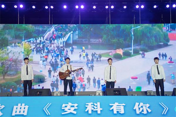 为筹备好系列演出活动,演出主创团队从五月份开始构思演出创意,撰写创作演出脚本,学生返校后即着手组建演出工作团队,面向全校青年学子遴选演员,150余名演职人员紧锣密鼓备战两个多月,共同实现了系列演出的精彩呈现。为确保演出质量,约请安徽省演艺集团国家一级导演沈晓梅女士担任艺术指导,全面提升系列展演艺术和表演水平。展演充分体现青年创意、青年才华,约请我校青年学子、创作型歌手卢一帆为母校70华诞量身打造献礼歌曲,引发广大师生和校友强烈的情感共鸣。制作发布校庆主题曲及MTV《青云志》,演出现场几度出现的数千人合唱的壮观场面令人心潮澎湃,豪情奔涌,一句“伟业树丰碑,报国助复兴,看笃行创新勇超越,安科学子皆鲲鹏”道出了安科青年学子豪迈气度与宏远志向。