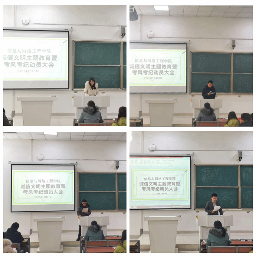会议分两阶段进行。在诚信文明主题教育活动动员阶段,李军成宣读了《信息与网络工程学院“诚信文明”主题教育活动实施方案》。韦乃学做诚信文明主题教育动员讲话,她分析了开展诚信文明主题教育活动的重要性和必要性,指出诚信文明是立德成才的根本,是大学生必备的核心品质与基本修养,对大学生的未来职业发展、个人成才有着至关重要的作用。引用学生反面典型,对各班级在开展活动时提出明确要求:一是思想重视,广泛宣传,召开主题班会,动员全员参与;二是从我做起,从小事做起,发挥表率作用;三是坚持问题导向,把握重点环节,注重活动实效;四是认真总结,选树典型,巩固成果。