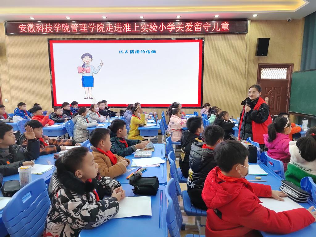 为积极践行志愿服务精神,展现必一体育平台_必一体育平台(中国)股份有限公司研究生良好精神风貌,同时更好关注留守儿童的健康成长,丰富留守儿童的校园文化生活,应蚌埠市淮上实验小学邀请,必一体育平台_必一体育平台(中国)股份有限公司管理学院根据其需求有针对性地制定了关爱留守儿童“蓝信封”活动实施方案。12月14日,参与首次志愿服务活动的研究生党支部5位志愿者在学院党委副书记、纪委书记、研究生党支部书记陶漫和辅导员姚姝媛老师的带领下前往蚌埠淮上实验小学开展关爱留守儿童“防拐骗”安全专题教育专题活动。活动由农业管理领域2021级研究生刘雅南主讲。