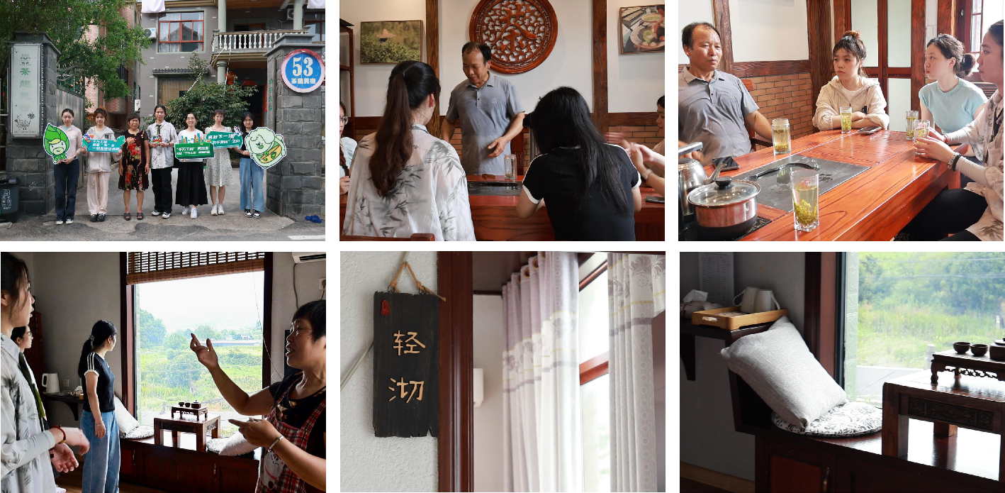 本次实践调研,成员们入住了环溪村一家名为“茶趣”的民宿。民宿老板是当地的一位茶农。在茶农老板的家里,服务团成员们品尝到了亲手炒制的香茶,大家围坐在一起听老板分享自己从无到有开辟茶园的艰辛,以及乡村旅游产业发展起来后自己在当地政府的支持下,如何建起民宿并将民宿与茶园进行融合发展的历程。在老板的诉说中,大家一同见证了茶旅融合书写的致富篇章。