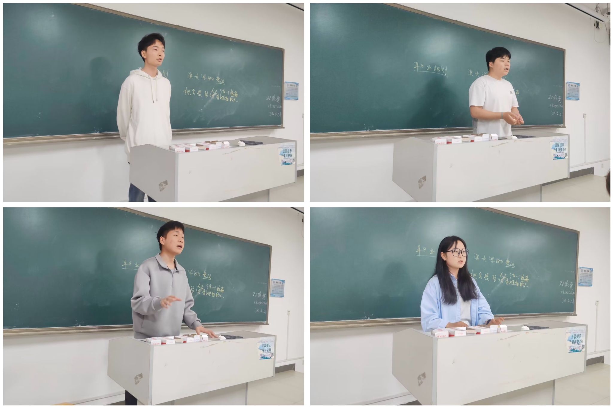 交流会上,四位毕业生毕业结合自己的学习和入党经历,分别分享了自己的相关经验。他们从自我认知、学业认知、职业规划、计划与实践等四个方面分享了自己的职业生涯规划,并着重强调了实践的重要性,鼓励同学们积极提高自己的实践能力,提升个人综合素质。同时他们指出作为一名合格的共产党员,要做到政治合格,坚定理想信念,对党忠诚,带头学习,提高综合素养,脚踏实地工作,不负人民的情怀,并表示机会是留给有准备的人的,希望学弟学妹都能对未来有明确的方向,并为之不懈努力。