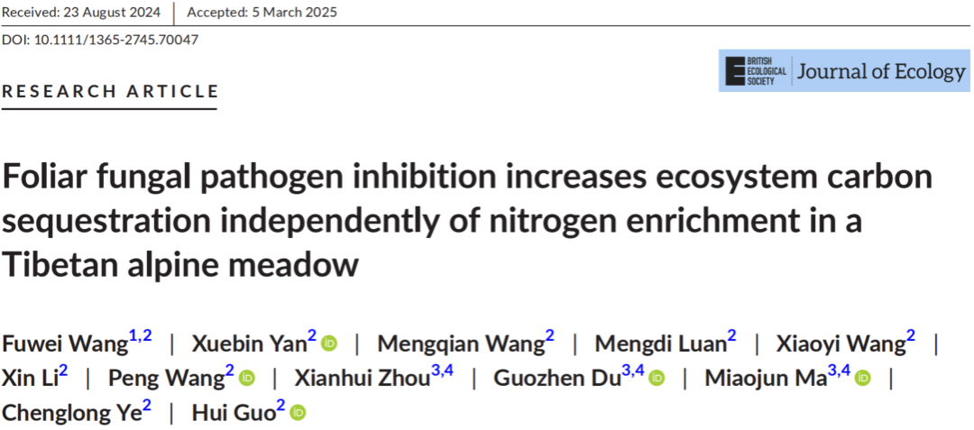 Fuwei Wang, Xuebin Yan, Mengqian Wang et al. Foliar fungal pathogen inhibition increases ecosystem carbon sequestration independently of nitrogen enrichment in a Tibetan alpine meadow. DOI: 10.1111/1365-2745.70047(特约通讯员:孟凡德 审核:沈树周)