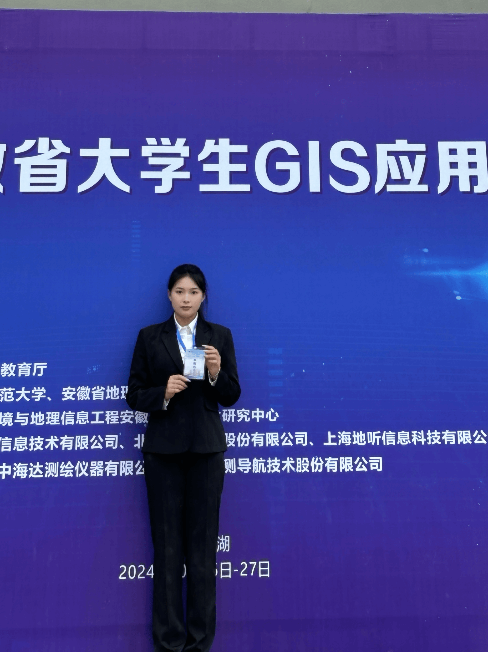 贾雯慧,女,中共预备党员,资源与环境学院地理信息科学2022级学生,曾任资源与环境学院学生会主席、校GIS协会会长、校易班工作站部长。曾获国家励志奖学金2次,校特等奖学金1次,校一等奖学金1次;获评校“三好学生”、“优秀学生干部”、“优秀共青团员”、“三下乡先进个人”等荣誉称号;曾获全国大学生测绘技能大赛二等奖、易智瑞GIS软件开发竞赛全国三等奖、安徽省GIS应用技能大赛一等奖、长三角空间信息技术大赛一等奖等,2025年主持省级大学生创新创业训练计划项目。