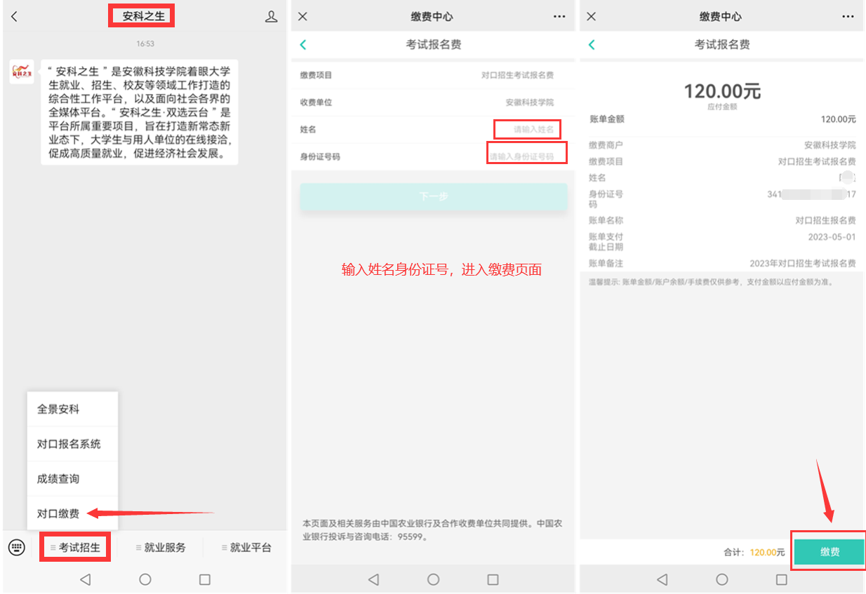 符合报考条件的,缴费成功的考生,学校将在招生信息网“通知公告”栏予以公布,请注意查对,如有问题请于5月1日17:30前反馈(咨询电话:0552-3197041;0550-6732041)。对不按时缴纳考试报名费的考生,学校不安排考试。考生因故不参加专业理论考试和专业技能测试的,不退还报名费。
