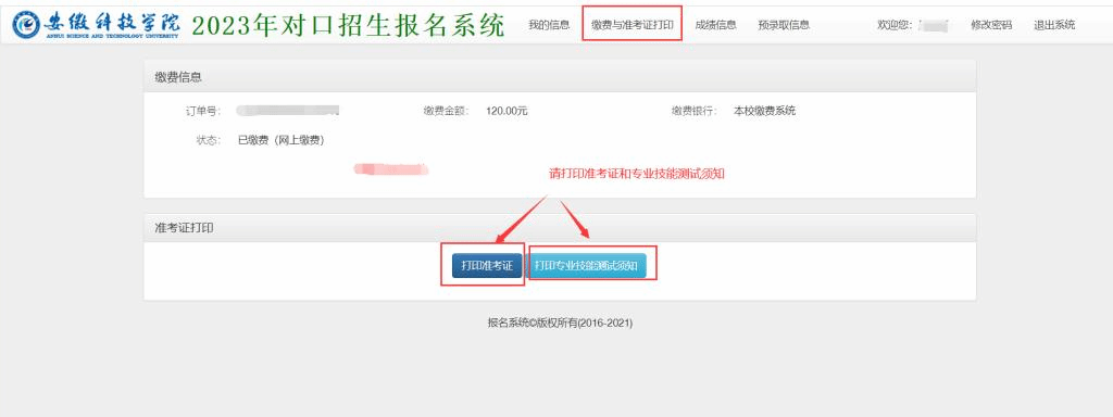 第三步:登录后,选择缴费与准考证打印,依次打印考生准考证和专业技能测试须知。