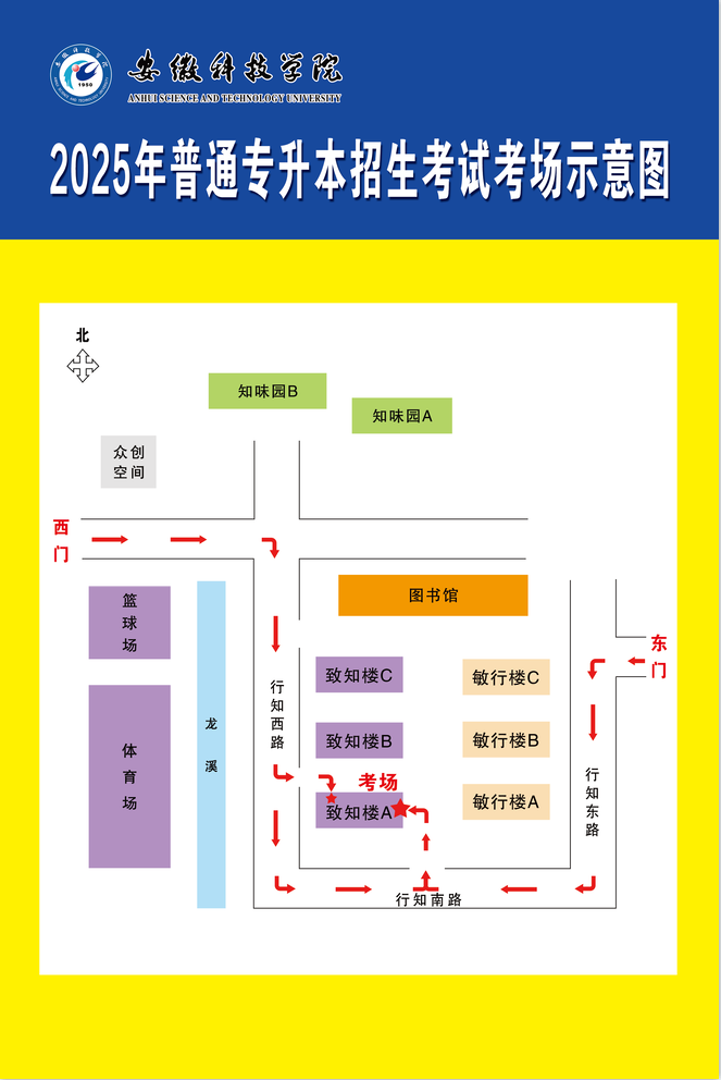 考场安排在蚌埠市龙湖校区的致知楼A座,考生可根据示意图所示由西门/东门前往考场。具体考场分布表见附件。