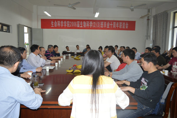 5月1日,生命科学学院2006届生物科学②③班校友从祖国各地齐聚母校举行毕业十周年联谊会。生命科学学院在学院会议室组织师生联谊会,生科院前任和现任领导和部分教师代表参加联谊会。
